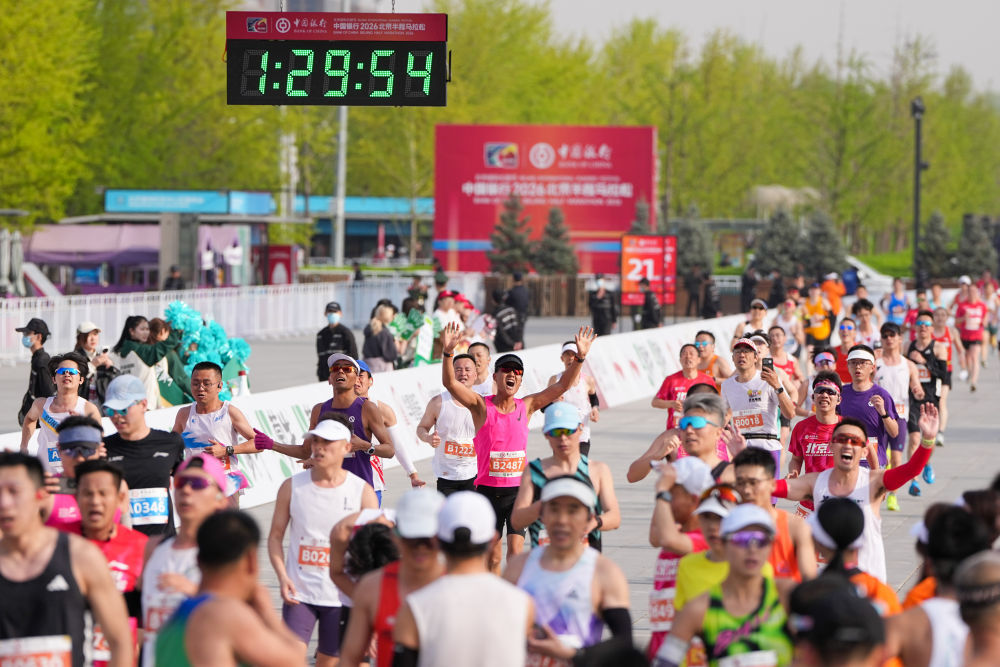 4月12日,2026北京半程马拉松参赛选手通过终点。新华社记者 鞠焕宗 摄