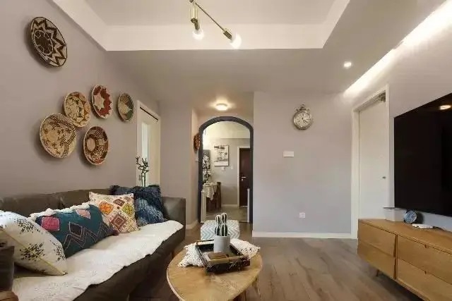 客厅设计令人眼前一亮,从客厅看向入户处,长长的走廊让整个空间显得格外宽敞。走廊上巧妙设计了拱形门洞,蓝色的门框与声控灯相得益彰,为空间增添了一抹亮色。客厅装修风格以田园时尚为主,色彩丰富却不失和谐。软装方面,虽看似丰富,但每一件都是性价比较高的装饰,既实用又美观。