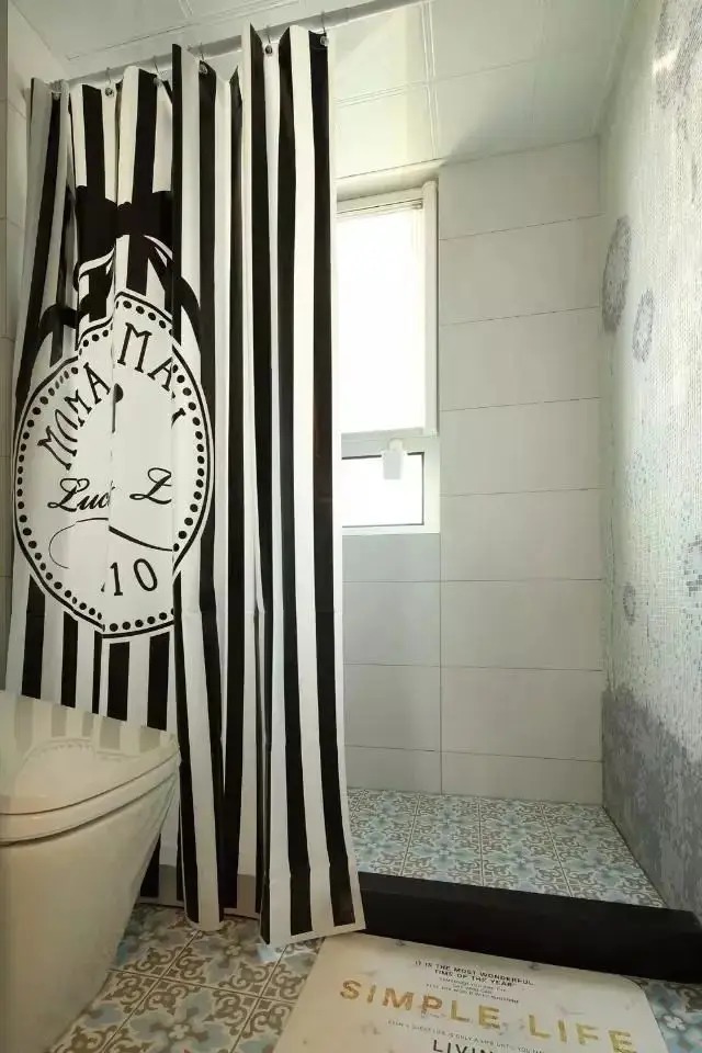 卫生间设计充满田园风格,瓷砖采用复古的碎花花纹,与整体田园风格相得益彰。墙砖大部分是普通白砖,但一面墙上贴上漂亮的碎花花纹,既不过于繁复又能保持美感。淋浴区与智能马桶通过浴帘分离,防水材质的浴帘实用又美观,黑白色调搭配让人眼前一亮。