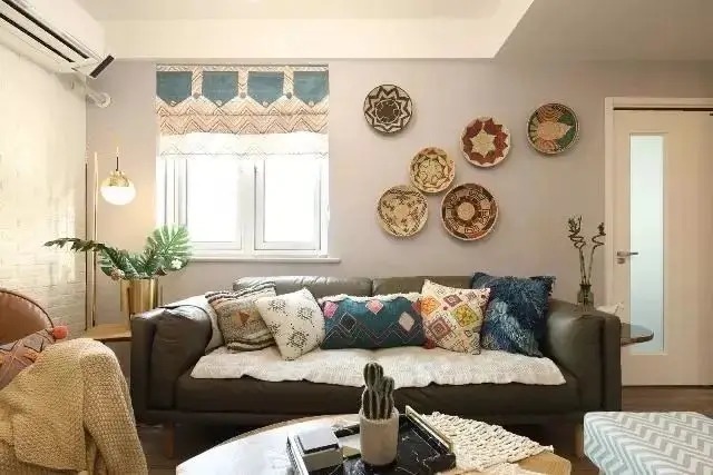 沙发区域是客厅软装重点,小窗户精心装饰后装上了半片式的日式头帘,既遮挡强光又保证透光性。墙面上用波普图案的文艺瓷盘装饰,随意摆放都有不错效果。沙发选了暗绿色的皮质沙发,两边搭配金属边几,再加上一个立式的金属台灯,整个空间复古又时尚。
