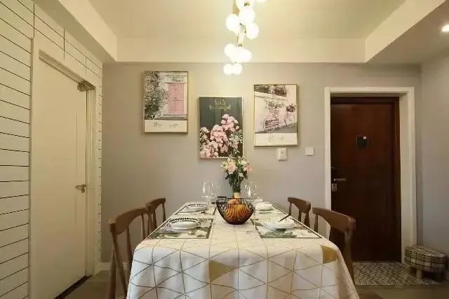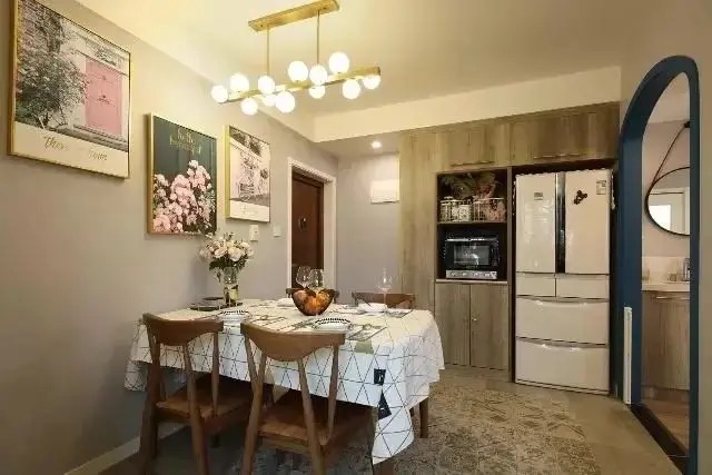 入户处的餐厅设计独具匠心,在这60平米的空间里,餐厅与入户处紧密相连,这种设计在小户型中并不多见。然而,正是这种巧妙的空间分配方式,让整个家显得更为宽敞。入户处摆放着一张换鞋凳,旁边是一个多功能柜,它既能用来存放餐具,又能放置鞋子。这个多功能柜是我特意根据冰箱和微波炉的尺寸定制的,能让微波炉完美嵌入其中,多余的展示柜面则用来摆放小摆件和调味品,让整个空间充满了生活气息。