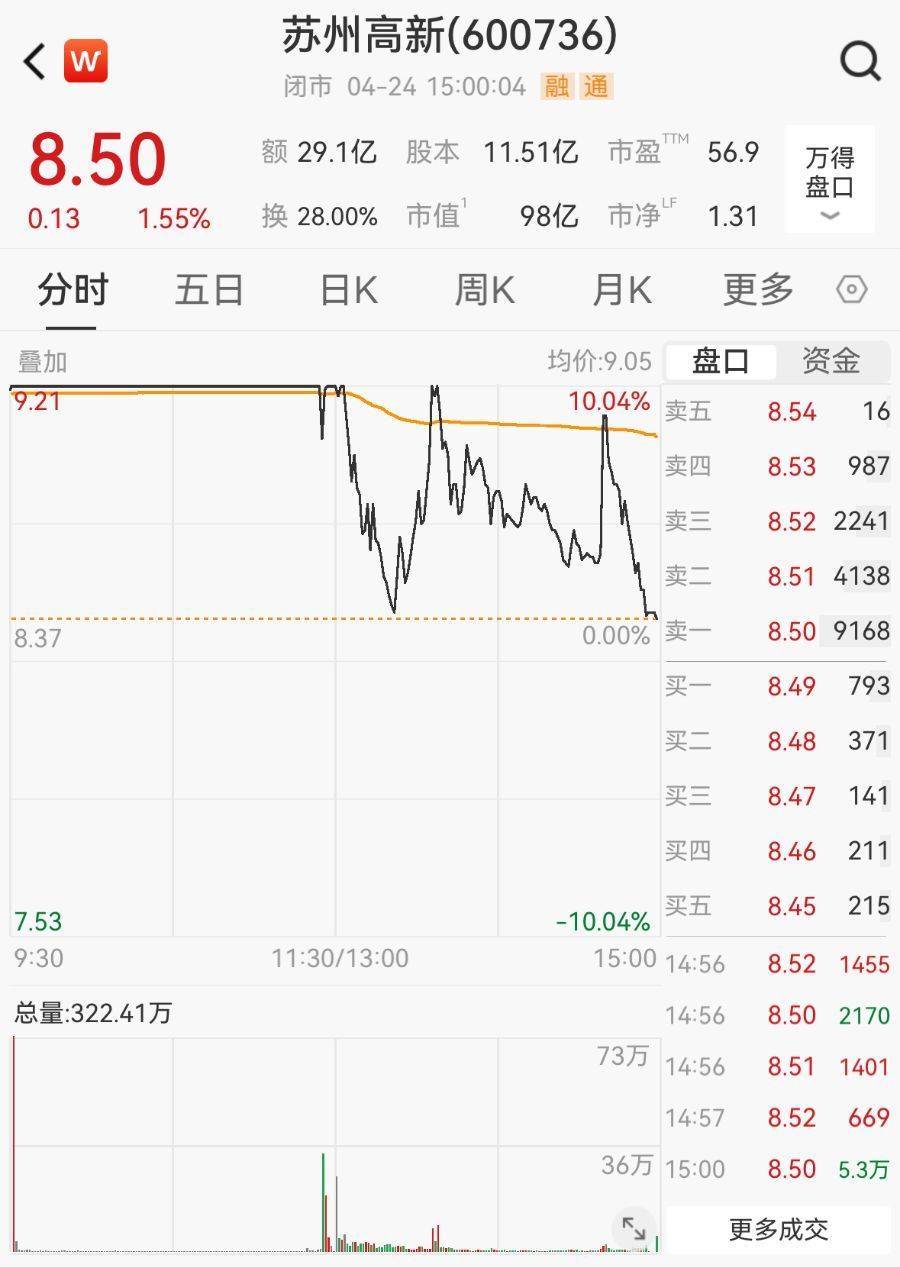 4月24日,苏州高新封板未遂,截至收盘,报8.5元/股,涨1.55%。此前,该股于4月21日至23日斩获“三连板”。