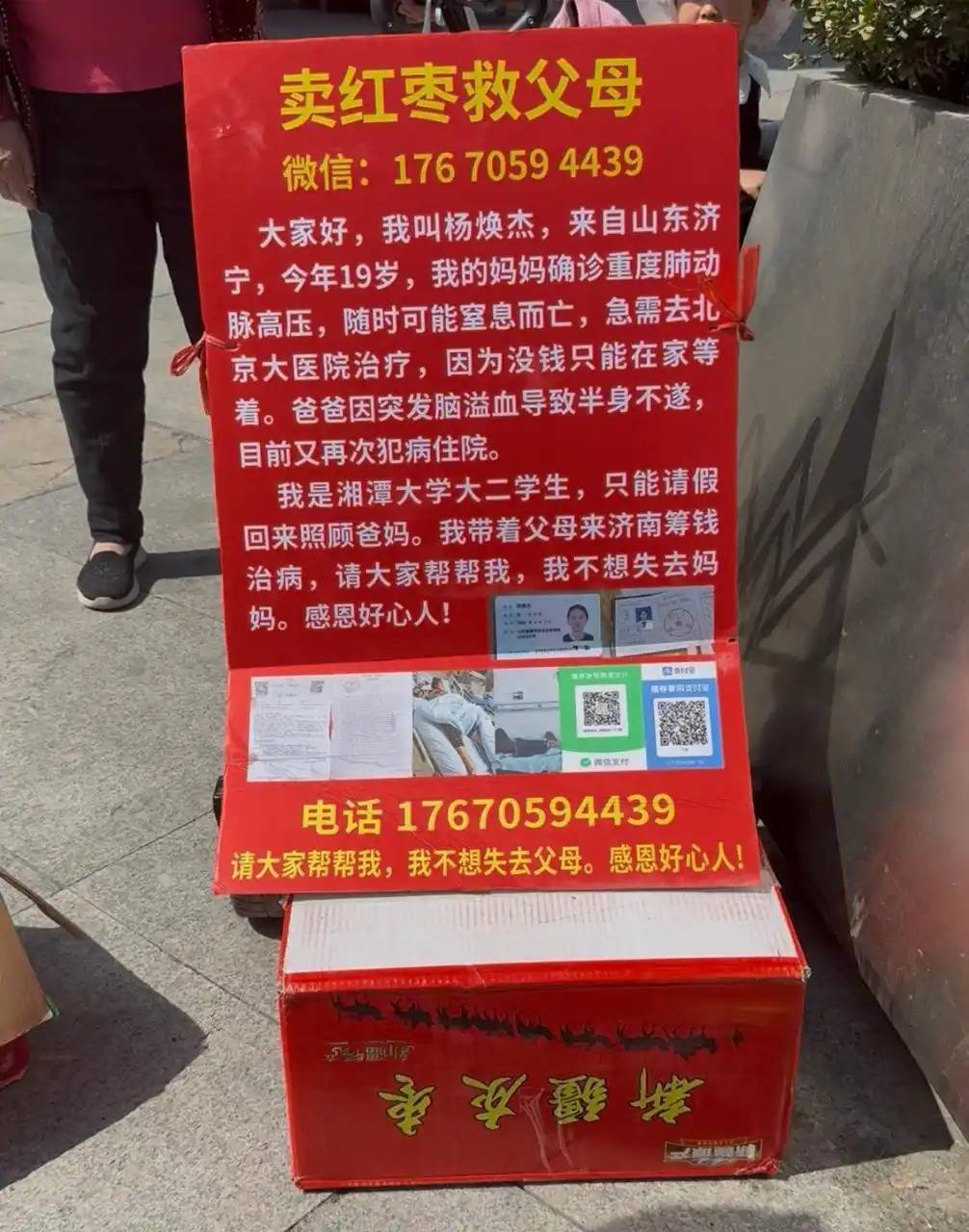 “她说在卖枣,手还哆嗦,我就赶紧把我的外套脱下给她穿上。看她不想走,肯定是想卖点钱,我就给了她点钱,拿了面包,让她天气好了再来。”龚爱芹说,帮杨焕杰收摊时才注意到旁边立的牌子上写着“卖红枣救父母”,看着很是心疼。